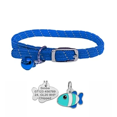 Reflective Softweave Cat Collar with Safety Elastic & Bell Personalised Fish Shape ID Pet Tag (Blue)