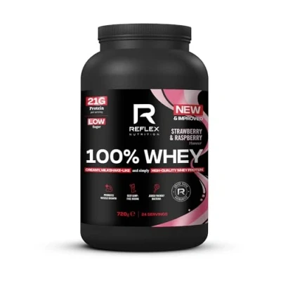Reflex Nutrition 100% Whey Protein 80% Pure EAA Amino Acids No Added Sugar Powder for Pre Workout & Post Recovery (Strawberry Raspberry, 720g, 24 Servings)