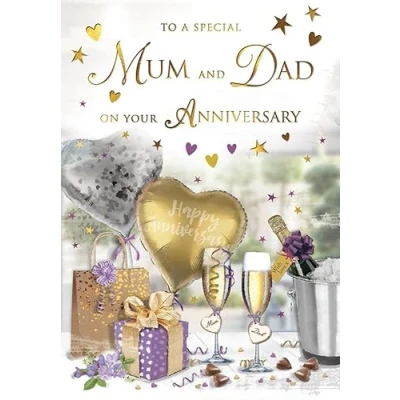 A High Quality Greeting Card and Envelope From Regal Publishing Designed and made in the UK - supporting British jobs Caption: Anniversary Mum & Dad Description: Flutes & gifts Approximate size: 9 x 6