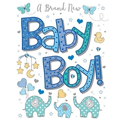 A High Quality Greeting Card and Envelope From Regal Publishing Designed and made in the UK - supporting British jobs Caption: Baby boy Description: Pizzaz Baby Boy Approximate size (inches): 8 x 6