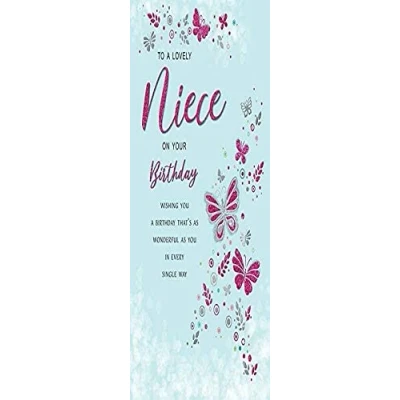 A High Quality Greeting Card and Envelope From Regal Publishing Designed and made in the UK - supporting British jobs Caption: Niece Description: Nova Niece Butterflies Approximate size: 9 x 6 inches