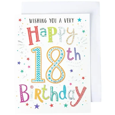 A High Quality Greeting Card and Envelope From Regal Publishing Designed and made in the UK - supporting British jobs Caption: Age 18 Birthday Description: Dazzles Age 18 Colourful text Approximate size: 8 x 6 inches