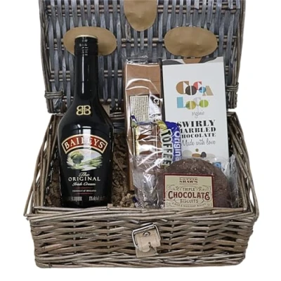 Exquisite Gift Basket: This delightful hamper contains a 35cl bottle of alcohol, a bar of swirly marbled chocolate, clotted cream fudge bar, original toffee and rich triple chocolate biscuits Artisanal Chocolate: Indulge in the swirly marbled chocolate, and the decadent triple chocolate biscuits Elegant Presentation: Beautifully arranged in a woven wicker basket, making it an ideal gift for Christmas, birthdays, or any special occasion.