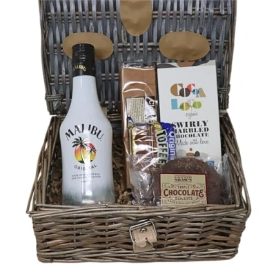 Exquisite Gift Basket: This delightful hamper contains a 35cl bottle of alcohol, a bar of swirly marbled chocolate, clotted cream fudge bar, original toffee and rich triple chocolate biscuits Artisanal Chocolate: Indulge in the swirly marbled chocolate, and the decadent triple chocolate biscuits Elegant Presentation: Beautifully arranged in a woven wicker basket, making it an ideal gift for Christmas, birthdays, or any special occasion.