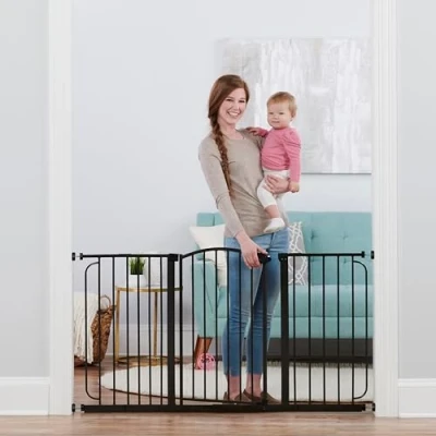 TESTED & TRUSTED BABY SAFETY GATE FOR OVER 30 YEARS – Parent-trusted safety gate certified by the Baby Safety Alliance FAMILY OWNED – Created by parents, for parents; Regalo is a family-owned US based brand delivering safety products tested and trusted for over 30 years; DÉCOR: Fashioned with high-end bronze finishes, walk through door that opens both directions EXTRA WIDE SAFETY GATE FOR DOORWAYS & BOTTOM OF STAIRS – Adjustable safety gate fits openings 75–150cm wide; Fits: 75cm-76cm (no extension) | 91-92cm (with 15,2cm extension) | 96,5-99cm (with 20,3cm extension) | 107-110,5cm (with 30,5cm extension) | 112-115cm (with 15,2cm & 20,3cm extensions) | 123-125,5cm (with 15,2cm & 30,5cm extensions) | 127-133cm (with 20,3cm & 30,5cm extensions) | 143,5-150cm (with 15,2cm & 20,3cm & 30,5cm extensions) Please be sure to measure your opening prior to purchase to ensure proper fit EASY SETUP WITH PRESSURE MOUNT DESIGN: Install according to manufacturer’s instructions; Wall cups must be used to keep the gate securely in place; To prevent falls, never use at the top of stairs CHILD & PET SAFE: Walk-through safety gate designed for babies; 6–24 months and small to medium pets; Features a secure safety locking system for parent convenience