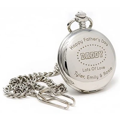 Premium Silver Pocket Watch. Click the customise now button to add your personalisation details and view a preview of what the watch will look like. Please note: The preview is only a mock-up of the watch & the final engraving size may vary. Personalise choosing a name and then changing the bottom line up to 20 characters. The pocket watch comes complete in a gift box along with a spare battery.