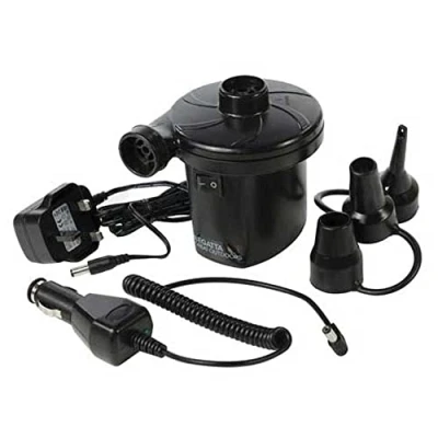 Get adventure ready with our Compact 240V AC/DC 12V Electric Pump. It comes with UK fitting for inflating and deflating air beds or other inflatable products. Perfect for off-grid camping. Includes 12V car charger and UK plug Includes three airbed nozzle adaptors