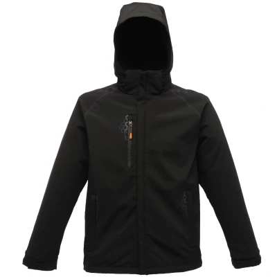 Warm backed softshell fabric. Durable water repellent finish. Mesh lined body. 2 zipped lower pockets and waterproof chest pocket. Detachable hood with adjuster. Articulated sleeve design. Adjustable cuffs. Adjustable shockcord hem. Concealed zip entrance in lining for embroidery access. Weight: 500g/m. Fabric: See features. 96% polyester/4% elastane.