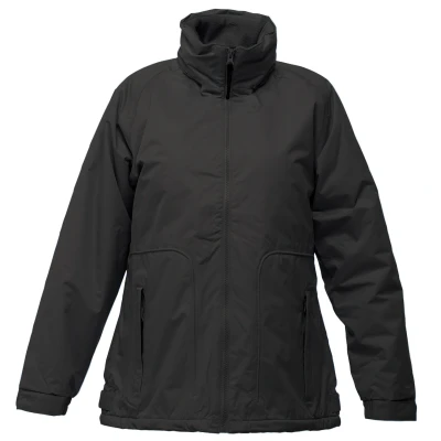 Waterproof Hydrafort polyester matrix dobby fabric with windproof fabric. 200 series anti-pill symmetry fleece lining with taped seams and fleece lined collar. Concealed hood with adjuster. Touch fastening adjustable cuffs. Mobile phone pocket and 2 zipped lower pockets. Studded side adjusters and adjustable shockcord hem. Embroidery access with shaped fit. Thermo guard insulation to sleeves. Size 10, 12, 14, 16, 18. Fabric Waterproof Hydrafort Polyester Matrix Dobby Fabric with Windproof Fabric