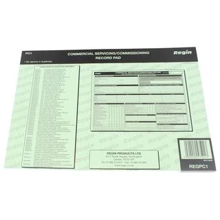 Regin Commercial Servicing/Commissioning Record Pad (REGPC1). 50 reports in duplicate Record essential checks and tests carried out while commissioning/servicing commercial appliances. Genuine brand new Regin product, covered by a Regin manufacturer's guarantee.