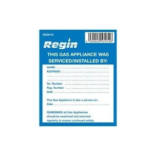 Direct Heating SparesRegin REGP10 Gas Appliance Serviced Sticker - Pack of 8. Genuine brand new Regin Heating Supplies product, covered by a Regin Heating Supplies manufacturer's guarantee.