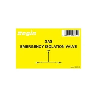 Regin Gas Isolation Valve Sticker - 8 Per Pack (REGP43). Pack of 8 stickers. Show clear indication of Emergency Isolation Valve for gas. Genuine brand new Regin product, covered by a Regin manufacturer's guarantee.
