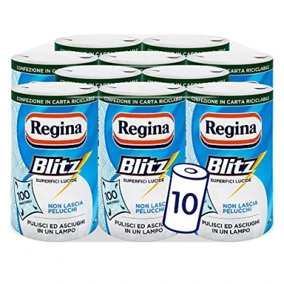Regina Blitz is the home paper that thanks to its 3-ply maxi sheets and the uniqueness of its texture, does not leave lint, allowing you to quickly and effectively clean all surfaces in the house Regina Blitz is even more environmentally friendly thanks to the recyclable paper packaging that contains 5 rolls of 3-ply towel paper, 100 sheets per roll (*5% tolerance) Its three layers of durable, absorbent paper and special texture make each tear of paper an irreplaceable aid for cleaning and removing dirt in your home Regina Blitz household paper is environmentally friendly because it is produced only from raw materials from responsibly managed forests and offered by FSC forest certification Regina Blitz is a Sofidel product, the first Italian company in the field of hygienic and household paper, adhering to WWF Climate Savers since 2008, a program to reduce greenhouse gas emissions