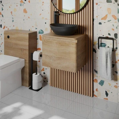 General description The Bathroom Cloakroom Vanity Unit Countertop Wash Basin is a stylish and functional addition to any modern bathroom. With its unique curved shape and elegant design, this unit combines ample storage with a sleek aesthetic. The soft-close drawers ensure quiet operation, making it perfect for late-night or early-morning use. The durable ceramic basin complements the vanity unit beautifully, and both come with a 15-year guarantee, reflecting the quality and longevity of the product. Technical specifications Overall Width: 500mm Overall Height: 520mm Overall Depth: 347mm Basin Dimensions: 410 x 330mm Basin Material: Ceramic Basin Shape: Round Tap Holes: 1 tap hole Unit Type: Countertop Vanity Unit Assembly: Pre-Assembled Installation Type: Wall Hung Colour: Oak Finish Woodgrain Soft Close Drawers: Yes Soft Close Doors: No Handle Style: Handleless Compatibility and accessories Compatible with high-rise mixer taps (not included) Various styles of taps available for