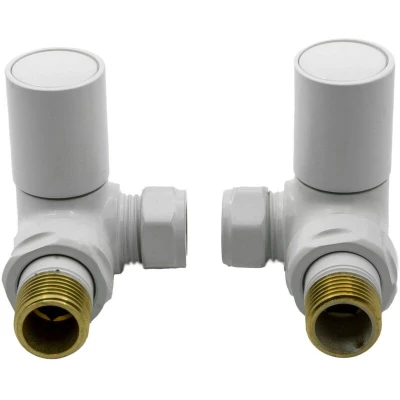 This pair of white Reina Crova Corner Radiator Valves adds a neat and professional finish to your radiator installation. They connect the radiator to the water supply parallel to your radiator, discreetly hiding the pipework from view and enhancing your room's appearance. These valves fit most standard radiators with 15mm inlet and outlet openings. Made from durable brass, they feature a stylish white finish that matches white radiators and complements various interior designs. Easy to install, they provide a 90 connection behind the wall. Comes with a 1-year warranty for peace of mind.. Reina Crova Corner Radiator Valves Pair - White Brass