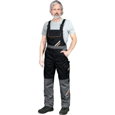 CERTIFIED WORK PANTS - Promaster work pants are made of 65% polyester and 35% cotton and with a weight of 300 g/m2 are ideal for technical tasks COMFORT OF WORKING - rubber at the waist level at the rear part which improves the liberty of movement and ensures better fitting, possibility of adjustment at the belt thanks to buttons and to regulate the length by braces FUNCTIONALITY - numerous pockets: one on the chest with Velcro, two at side parts, two at the rear part with Velcro, on the trouser leg (for tools) and one side pocket with Velcro, also there are pockets in knee pads. Also, they have terminal dedicated to keys SAFE MATERIAL - tested for harmful substances according to OEKO-TEX Standard 100