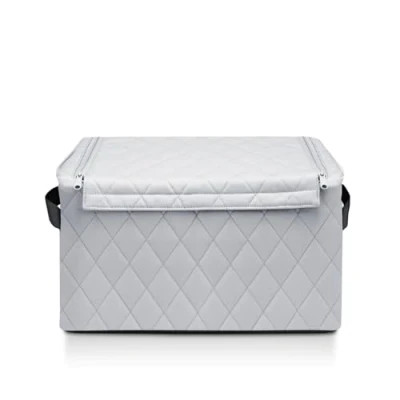 Closable with 2 zips and velcro closure. 2 carrying handles Dimensionally stable construction with foldable wire internal frame Rigid bottom