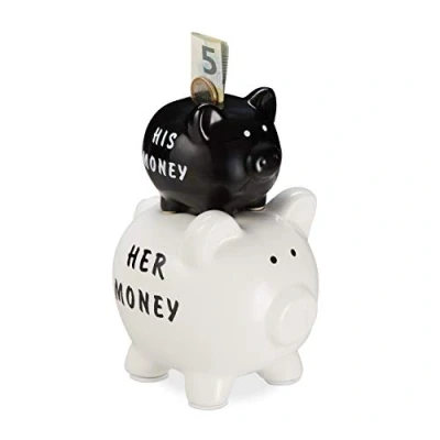 Double: 2 pigs on top of each other with inscription His and Her Money - for small change and notes For couples: Money box as a funny gift idea for couples - his money automatically ends up with hers Gift: Money box is ideal for original and funny money gifts for weddings, engagements and much more Decorative: Ceramic money box in white and black with inscription - shiny look is eye-catching Details: Ceramic savings jar - HxWxD approx. 20 x 14 x 12 cm - with rubber stopper and non-slip pads