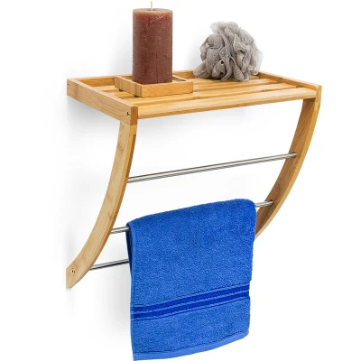 General description This towel holder features 3 towel rails and a large shelf, providing ample storage space in your bathroom. The ascending towel rails allow for optimum air circulation, ensuring your towels dry faster. The large shelf can accommodate towels, cosmetics, and other bathroom accessories or decorative items. Made of natural bamboo with chrome-plated metal rails, this versatile storage solution can also serve as a coat rack in the hallway. Technical specifications Dimensions: 40 x 38 x 24.5 cm (15.7 x 15 x 9.6 in) Weight: approx 0.9 kg (2 lbs) Material: Bamboo and chromed metal 3 towel rails made of chromed metal 1 storage shelf with 5 bamboo beams Installation Quick and easy to mount to the wall Includes assembly instructions and materials Usage Can be used as a towel holder or decorative wall-mounted coat rack Space-saving alternative to traditional towel holders Other information Decorative items in product photos are not included in delivery
