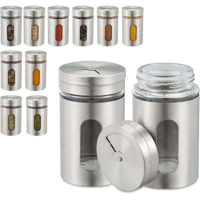 Relaxdays 10027637 Spice Shaker Set of 12, 3 Dispensing Sizes, Window, Herb Jars, Glass, Stainless Steel, Containers, Silver, Plastic