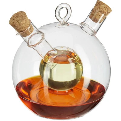 General description The Relaxdays Oil and Vinegar Dispenser is a practical and elegant kitchen accessory designed for both special occasions and everyday cooking. This transparent glass bottle features two separate compartments for oil and vinegar, each sealed with cork stoppers to preserve freshness. Its stylish round shape makes it a perfect addition to any dining table, and it also serves as a thoughtful gift for friends and family. Technical specifications Total size (H x W x D): approx. 11 x 12.5 x 10 cm Inner bottle size (H x D): approx. 9.5 x 4 cm Large jug capacity: approx. 375 ml Small jug capacity: approx. 50 ml Opening diameter: approx. 1.5 cm Weight: approx. 90 g Material: Glass, cork Colour: Transparent Included in Delivery 1 x Oil Vinegar Dispenser 2 x Cork Stoppers Decorative items shown are not included