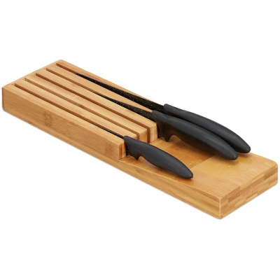 AmazonUniversal: Compact storage solution for 5 knives with max. 0.6 cm blade width Tidy: Organise your knives collection and neatly store your kitchen utensils Compact: The knife block is ideal as in-drawer insert or tabletop accessory Safe: Knifes are stored with the sharp blade facing downwards to prevent injuries in the kitchen Basics: Modern knife block H x W x D: app. 3.5 x 11 x 39 cm - Made of natural bamboo, Manufacturer: Relaxdays