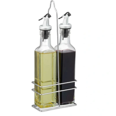 Amazon2 in 1: Glass carafes are a practical kitchen accessory - ideal storage solution for oil and vinegar Handy: Transparent bottles with stable holder - set made of stainless steel Kitchen: Practical oil and vinegar dispenser for kitchen and dining table Versatile: Transparent set is also ideal for soy, chilli sauce, dressings and more Basics: Compact dispenser set H x W x D: app. 25 x 5 x 5 cm - Volume: app. 250 ml each, Weight: 1.3668660244 Pounds, Manufacturer: Relaxdays
