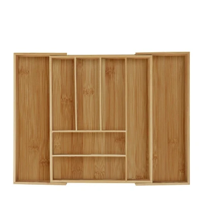 AmazonExtendable: bamboo cutlery tray with 6 compartments and 2 side compartments - Adjustable width Storage: Cutlery drawer insert for knives, forks, spoons and various cooking utensils Organisation: All kitchen utensils in one place - No more rummaging around in the drawer Versatile: Organiser for storing crafting and sewing supplies and other small items Basics: Bamboo cutlery tray, min. size approx. 6.5 x 35 x 43 cm - Extended 6.5 x 57.5 x 43 cm