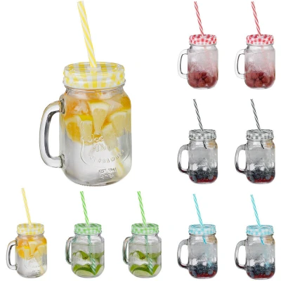 General description This set of 10 drinking jars is perfect for enjoying refreshing cold drinks such as juices, lemonades, iced tea, and cocktails. With their decorative Ball Mason Jar design, these vintage glasses will be an eye-catcher in your home bar or at your next garden party. The included straws allow for quick sipping, while the practical screw lids protect the contents from dirt and insects, making them ideal for summer gatherings with friends. Technical specifications Dimensions with lid (H x W x D): approx. 13.5 x 11 x 8 cm Straw dimensions (H x Ø): approx. 18 x 0.7 cm Volume: approx. 500 ml Weight per glass: approx. 300 g Material: Glass, steel, plastic Colour of glasses: Transparent Colours of lids: Blue, green, yellow, red, black Usage Suitable for iced tea, smoothies, juice, cocktails, and more Ideal for children's birthday parties and garden parties Insect-free drinking thanks to practical screw-on lid Dishwasher safe, including straw and lid Other information