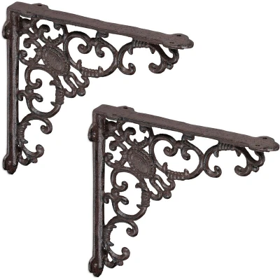 AmazonSet of 2: Two shelf brackets in brown colour - Turn shelves into accentuating wall shelves Decorative: Shelf supports with baroque-style ornaments - Radiates nostalgic charm Antique: Shelf angle in trendy vintage look - Fits country house and art nouveau interiors Weatherproof: Angle wall bracket made of solid cast iron - Also suitable for protected outdoor areas Basics: Dimensions of an angle bracket HxWxD: 21.5 x 4 x 21.5 cm - Load capacity of the set: 15 kg