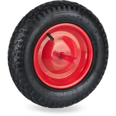 General description This pneumatic cart wheel is the perfect replacement tyre for your home wheelbarrow. The inflatable design with a red steel rim makes it easy to manoeuvre and provides a cushion on uneven terrain. The fixed axle enhances shock resistance, ensuring durability and reliability during use. Technical specifications Tyre size: 3.50-8 Wheel diameter: approx. 36 cm Wheel width: approx. 8.5 cm Load capacity: approx. 120 kg Weight: approx. 2.3 kg Material: Rubber, steel Colour: Black, red Max. pressure: 2 bars (30 psi) Axle diameter: approx. 2 cm Length of axle on each side: approx. 10 cm Rim diameter: approx. 22 cm Usage This spare tyre is suitable for wheelbarrows, garden carts, and similar applications. The tread features a block pattern for improved driving control, making it ideal for various terrains. Other information Spare tyre with car valve for easy inflation Included in delivery: 1 x wheelbarrow wheel (decorative items not included)