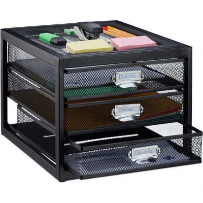 General description Set your desk in order with this stylish Relaxdays Desk Organiser, designed to neatly store important documents and stationery. It features 3 drawers that accommodate letters, folders, and invoices, allowing for organized sorting. Additionally, you can store pens, paperclips, and sticky notes within easy reach. The included labelling tags enable flexible identification of each drawer's contents. Technical specifications Dimensions (H x W x D): approx. 23 x 27.5 x 35 cm Drawer size (H x W x D): approx. 5 x 24.5 x 34.5 cm Weight: approx. 2.9 kg Capacity: approx. 4 kg Material: Steel Other information Includes 1 x 3-Compartment Filing Rack and labelling tags. Decorative items shown in product photos are not included.