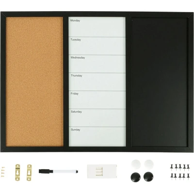 The practical combination board for the wall is the ideal companion for organising and planning daily office life. Write to‑do lists, tasks and reminders on the board or pin notes to the cork panel. The whiteboard also includes a practical weekly planner. The accessory set with pen, chalk pieces, magnets and pins makes the writing board ready to use immediately. The magnetic board is also useful in the kitchen or hall for shopping lists, photos and more. Combination board in detail - Size 1 H x W x D: approx. 40 x 60 x 2 cm / approx. 1.4 kg - Size 2 H x W x D: approx. 50 x 70 x 2 cm / approx. 1.9 kg - Size 3 H x W x D: approx. 60 x 90 x 2 cm / approx. 3 kg - Material: MDF, steel, cork - Colour: black, white, natural Magnetic memo board for hanging - Ideal for planning and organising at home or in the office - Practical combination of chalkboard, whiteboard with weekly planner and corkboard - Complete with pen, chalk pieces, magnets and pins – ready to use - Magnetic board for notes,