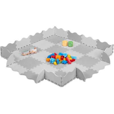 AmazonPlayful: Soft crawling mat for the nursery - Can be put together in different ways - In grey 36-piece playmat - Perfect for first-hand jigsaw experience - Keeps off cold floors Non-toxic material: Mat is made of EVA foam - Free from BPA and AZO - Safe for babies and toddlers Durable: Shock-absorbing tiles -with water-repellent characteristics - Protects from cold floors Handy: The frame of the jigsaw playmat can be erected to create a clear boundary of theplay zone