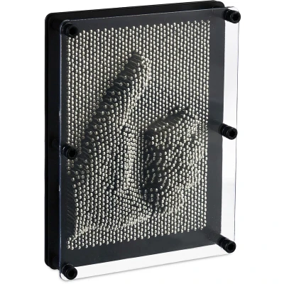 General description Get creative with pin art! The Relaxdays 3D Nail Pinart allows you to immortalize your hands, face, or other objects in stunning sculptures made from metal pins. With this 3D nail board, you can create fantastic three-dimensional images in just a few seconds. Simply push the body part or object into the nails from behind and admire the finished work of art. Leave the board upright to add a personal touch to your living space. Technical specifications Size H x W x D: approx. 18 x 13 x 3.5 cm Material: Metal, plastic Weight: approx. 0.6 kg Colour: Silver, black Usage Press hands or objects into the nails from behind Metal pins lift at the appropriate points to create stunning sculptures Simply flip the board over to erase images and start again Other information The nails are rounded to reduce the risk of injury