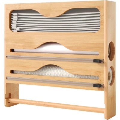 Amazon Marketplace4 in 1: Wall-mounted roll holder for storing kitchen roll, freezer bags, cling film, and foil Hanging: Household rolls are always accessible – kitchen roll holder for space-saving wall mounting Simple: Foil holder with sliding cutter - clean cuts and safe, concealed blades Material: Cling film dispenser made from sturdy bamboo – adds natural charm to your kitchen Paper towel holder, HxWxD approx. 33 x 34.5 x 7 cm – fits rolls up to 30 cm wide