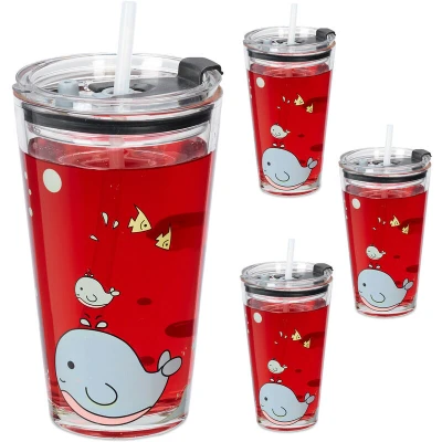 Relaxdays 4X Children's Cups, Whale Motif, Drinking Glass for Kids, with Handle, Lid & Straw, 450 ml Scale, Transparent, 15 x 9 9.5 cm