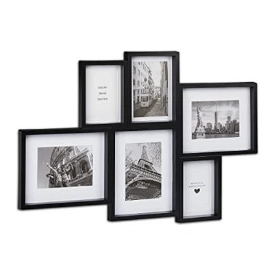 Decorative: large interlocking picture frame for 6 photos - version in classic black Versatile: wall frame for photos, postcards, drawings - memory pictures with family and friends Flexible: collage for different pictures in portrait and landscape format - can be hung on the wall on the hook Format: photo collage with 4 mounts in size approx. 11 x 17 cm and 2 in size approx. 9 x 13 cm Details: sturdy gallery frame with plastic panes. Dimensions (H x W x D): approx. 51 x 75.5 x 2.5 cm