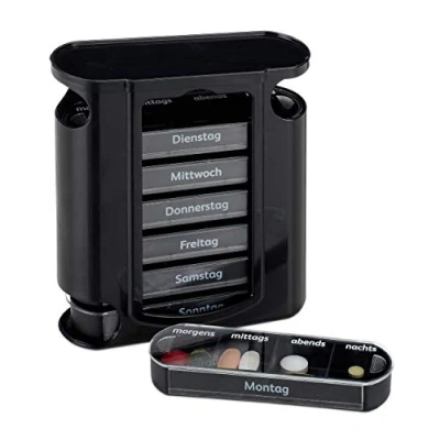 7 Days: Pill box for regular medicine intake (morning, noon, evening and night) - 4 Compartments Handy: Pill tower with individual removable day boxes - Tower in black For travels: Ideal travel dispenser - Pill box can be stowed away in your pockets Labelled: Pill case with clear daytime and day labels - No more mix-ups Robust: Medicine box with sliding lid - Secure storage of pills, vitamins etc.