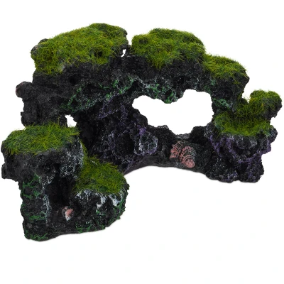 General description This Relaxdays Aquarium Decoration features a natural look with mossy rocks and shells, perfect for enhancing your aquarium landscape. Whether you're setting up a nano tank or revamping a large saltwater aquarium, this rock formation provides an excellent hiding place for small fish and shrimps. The vibrant green artificial moss and pink shells add a striking visual element to your tank. Technical specifications Total size (H x W x D): approximately 8.5 x 17 x 9 cm Hole diameter: approximately 1 - 4 cm Material: Synthetic resin Colour: Grey-green with purple and pink details Weight: approximately 150 g Installation Rinse thoroughly under running water before first use. Do not use any cleaning agents or boil the decoration. Usage This decorative aquarium rock formation is ideal for creating beautiful landscapes in both fish tanks and terrariums. It offers a great 3D effect and looks aesthetic from all angles, making it especially eye-catching on light or colored
