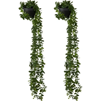 General description Give your home a fresh and green touch with our set of 2 artificial eucalyptus plants. These realistic-looking hanging plants in pots make for excellent decor in the living room, bedroom, and kitchen, whether placed on a windowsill, shelf, or cupboard. The long tendrils of these houseplants create a natural look, adding a lifelike appearance similar to genuine plants. Technical specifications Total dimensions H x D: approx. 80 x 20 cm Pot dimensions H x D: approx. 8.5 x 10 cm Weight: approx. 300 g each Material: Plastic, foam Colour: Green, black Usage Ideal for windowsills, shelves, cupboards, and more Fantastic decor for living room, bedroom, office, etc. No watering or sunlight required Durable material that won't fade or wilt
