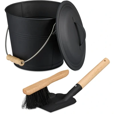 Relaxdays Ash Bucket with Lid & Sweeping Set, 4.5 Litres, Shovel Broom, Fireplace Bin, Container Handle, Black