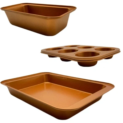 AmazonBaking fun: 3-piece bakeware set – 6-muffin tray, loaf and roasting tin Non-stick: Bakeware with non-stick coating – easy release and cleaning Robust: Carbon-steel bakeware set for even heat – heat resistant to 230 °C Versatile: tin set for muffins, loaves, bread, roasts, casseroles and more. Details: Hand-wash cake tins – decorative copper-coloured finish