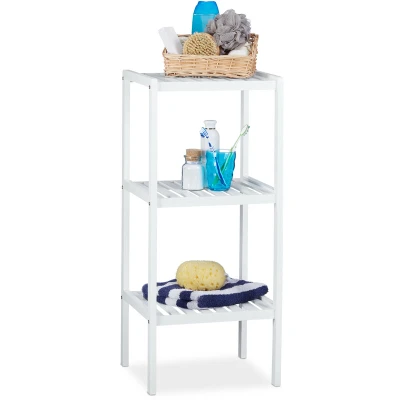 General description With this freestanding bamboo rack, you can finally organize your bathroom, kitchen, or hallway. The 3 shelves provide ample space for towels, books, shoes, and more. Its compact size makes it perfect for small spaces, while the open shelves allow for quick access to towels, cosmetics, and other supplies. The bright white finish is also ideal for children's bedrooms or playrooms, helping to keep toys and stuffed animals off the floor with its colorful design. Technical specifications Total size: HxWxD: approx. 80 x 34.5 x 33 cm Size per compartment: HxWxD: 31.5 x 31.5 cm Distance between shelves: approx. 27.5 cm Distance to floor: approx. 18.5 cm Max. capacity per shelf: 10 kg Weight: approx. 2.4 kg Material: Bamboo, lacquered white Included in Delivery Bath rack in pieces Assembly materials Instructions Decorative items shown in product photos are not included