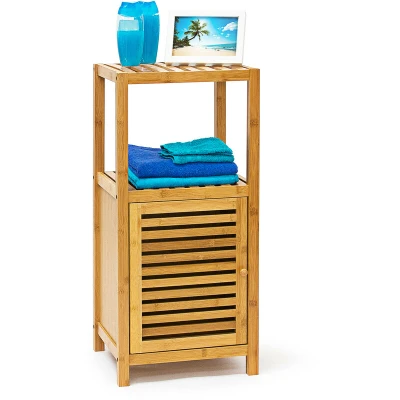 Relaxdays Bamboo Bathroom Shelves, 80 x 36.5 33 cm, Rack with Wooden Door Free Shelf Wood 3 Tier Stand, Brown
