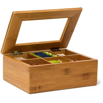 Amazon MarketplaceMaintain the aroma of your tea bags for as long as possible to enjoy them to the fullest Beautiful tea box made of natural, lacquered bamboo Store various kinds of tea and save space with 6 or 8 compartments Closable wooden box with lid and window made out of glass High-quality product made of renewable, environmentally-friendly bamboo