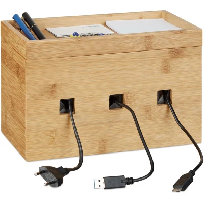 Amazon MarketplaceTidy: Cable box for hiding your power strip - No more tangled-up cables - Prevents sockets and connections from getting dusty - No more mess! Multiple: Charging station for up to 3 devices - Charge smartphone, mobile phone and tablet at simultaneously - Cable sleeve organizer - With handy tray on top Naturally lovely: As all bamboo product, this item oozes a certain soothing warmth - Appealing modern design - Natural grain and colour Compact: H x W x D: app. 16.5 x 25.5 x 14 cm - 3 square cable openings - Removable floor - Lid Versatile: Organizer for tidy storage of TV cables in the living room, your PC or laptop on the desk or for charging cables of smartphones, mobiles and tablets
