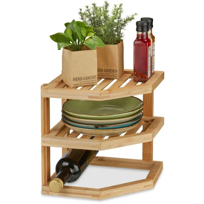 AmazonShelf: Space-saving corner shelf for additional storage space in the kitchen cupboard or worktop Details: Plate rack with 2 levels - Dimensions HWD: approx. 25.5x25.5x25.5 cm Kitchen organisation: Shelf insert for storing spices, oil and vinegar bottles, plates, etc. Material: Cupboard insert made of bamboo with decorative grain - Natural charm for the kitchen All-rounder: Table shelf also for cosmetics in the bathroom or office utensils on the desk