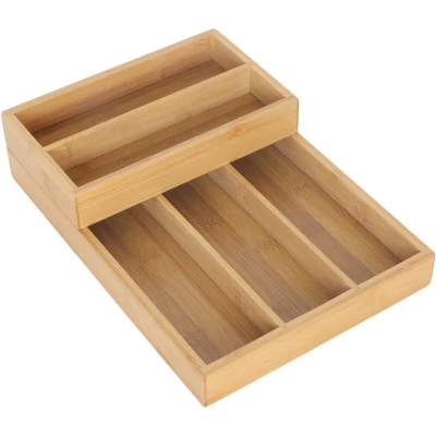 AmazonFlexible: 2-piece bamboo cutlery tray with 6 compartments – usable side by side or stacked Organise: Neatly store knives, forks, spoons and other kitchen utensils in drawer trays Space-saving: stackable cutlery tray perfect for narrow and small drawers without standard sizes Versatile: drawer insert for storing craft, sewing supplies and small items Facts: Cutlery tray with 2 tiers - Small: 3.5 x 21 x 12.5 cm - Large: 3.5 x 21 x 30 cm