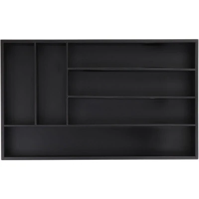 General description Say goodbye to chaos in your cutlery drawer with our innovative cutlery storage solution. Equipped with 6 spacious compartments, this drawer insert provides ample room for your cutlery and various other kitchen utensils. Moreover, this versatile drawer organiser can be used beyond the kitchen - it's ideal for organising office and craft supplies as well. Cleaning this cutlery organiser is a breeze, requiring only a quick wipe with a damp cloth. Technical specifications Dimensions (H x W x D): approx. 5 x 46 x 28 cm Size of large horizontal compartment (H x W x D): approx. 4 x 44.5 x 7 cm Size of 3 horizontal compartments (H x W x D): approx. 4 x 29.5 x 6 cm Size of 2 vertical compartments (H x W x D): approx. 4 x 7 x 19 cm Weight: approx. 800 g Material: Bamboo, MDF Colour: Black Compatibility and accessories Perfect for medium and large drawers Installation Ensure to measure your drawer to confirm the tray will fit It is also recommended to measure your cutlery